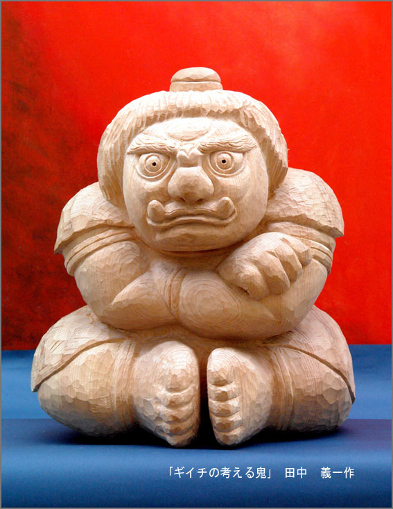友人が 「ギイチの考える鬼」 と命名してくれた。取りあえず完成したことにする。しばらく他の作品を作りながら眺めていると手を加えたいところが見えてくる。その時 もう一度ノミを入れることにする。どの作品も作者自らの姿だ。権威のある鬼にしてやろうと思っていたのに 何も考えていないとぼけてる作品になってしまった。