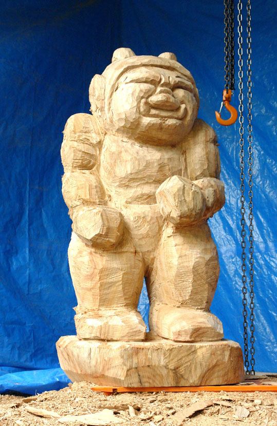 このサイズの彫刻になると 立てる 寝せる 裏返す等の作業に大変な労力がいる。自力では無理なので 1t用のチェンブロックで上げ下げして向きを変える。危険な作業なので細心の注意を払う。向き換えと 彫る作業時間がほぼ同じくらいである。チェンソー 一本の作業は終了し これからノミの作業に入る。