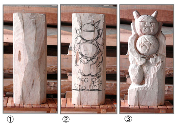北軽井沢に暮らす人たちの中にも 「鬼好き」がいる。浅間山の噴火でできた奇石群で有名な 「鬼押し出し」があることで 鬼を身近な存在に思っているのであろう。この人たちの為に「鬼の道祖神」を作ることにした。高さ75cmあまりの クス材に 無造作に下図を描き彫り始めた。