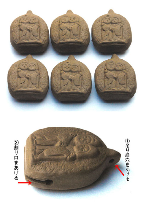 @ 吊り紐穴をあける。 A 割りを入れ型取り完了。石膏型を丁寧に取っても その型によって 粘土詰めの作業がそれぞれ微妙に違う。型に慣れてくると 半日で2.30個型取りできる。乾燥した後 焼成する。(使用粘土−テラコッタ)