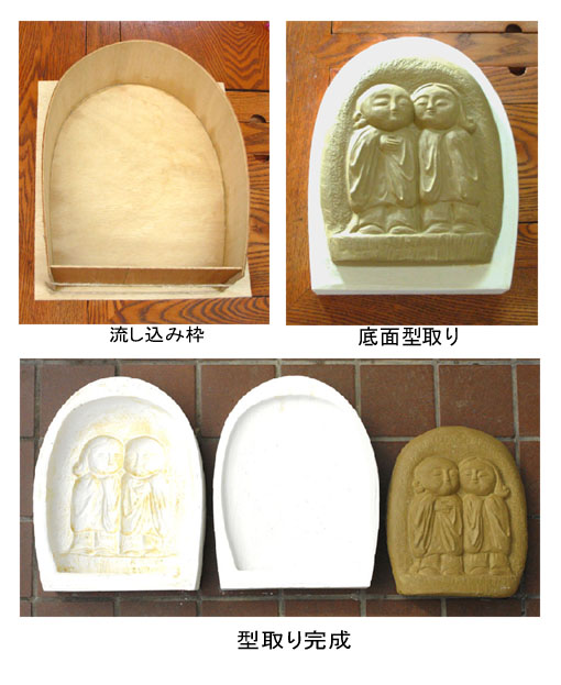 陶芸家は 石膏流し枠をタタラ切りした粘土板を作る。私は 小さい作品は厚紙で やや大き目の作品はベニヤ板で作ることにしている。はじめに下型になる部分に石膏を流し込む。固まった段階で枠をはずし 上型との合わさり目を整え 剥離材を塗る。再び枠を付け 上型の部分に石膏を流す。固まったら上下を割り石膏型が完成する。丁寧に抜くと 原型は壊れることなく取り出せるので 同じ型を数個作ることも出来る。
