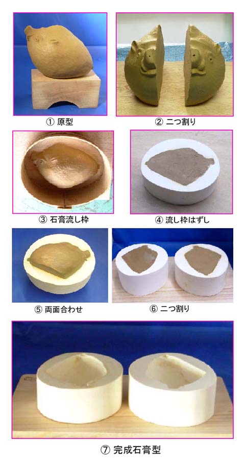 前作の石膏取りのやり方と違い 原型を二つ割りにし 石膏を流す方法をとった。流し枠に 片方を合わせ面を下にして置き 石膏を流す。片面が完成した後 もう一方を合わせて 2回目の石膏を流す。固まったら 割って原型を取り出し石膏型完成。