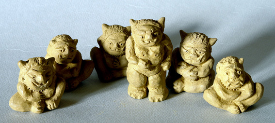 四天王に踏みつけられた邪鬼を見たのが鬼を彫る切っ掛けになりました。踏みつけられても不満そうな顔はしていません。「宜しかったらいつまでも どうぞ。」 と言っているように見えました。この寛大さが好きになりました。以来 何体もの「鬼」を刻みました。四天王の世界に一緒に住む「鬼」も 佛の仲間にちがいない と 理屈を付けて「千体佛」の仲間に入れてやることにしました。( 座像 約4cm・立像 約6cm)