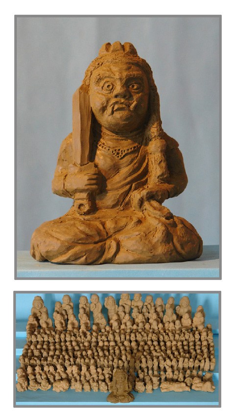 作るもの 作るもの みんなとぼけた表情になってしまいます。阿弥陀さんも 大日さんも 地蔵さんも この不動さんも みなぼけっとしています。仏さん特有の慈愛に満ちた表情も威厳も全くありません。不動さんに取りかかったとき 今度はきつい表情にしようと思ったのです。完成しますと この表情です。なぜなんでしょうか。