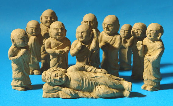 釈迦涅槃像に十大弟子を加えました。前回配信した涅槃像について 友人からメールが届きました。「釈迦は昼寝でもするような気持ちで入定したのではないか。だから お前の作った釈迦像の表情でいい。」 と言うのです。そう見ると周りの十大弟子も苦悩に満ちた表情でなくていい と 勝手に納得しています。