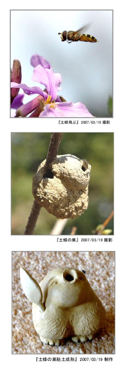 例年に比べて10日ばかり早くハチが飛び合うようになりました。土蜂がうまくファインダーに入りました。振り返ると木の枝に土蜂の巣がありました。まるで現代彫刻作品を思わせるような見事な造形です。早速 模作してみました。何千年も伝承されてきた彼らの技にはとてもかないません。