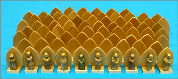 庭からミツバチが去っていったので 千体佛作りに専念出来ます。彩色の済んだ仏さんの光背作りをしました。短時間に完成させた仏さんも 光背を付けてやると一段と輝きを増します。糸鋸で切り抜いた光背に 座台を付ける作業は 「仏さん作り」の倍の時間がかかります。像作りの合間に 辛抱強くコツコツ作ります。
