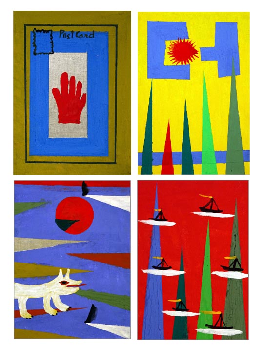 F4作品20点を展示したのは御村氏です。何とも微笑ましいこの作品は展覧会会場を明るくしてくれました。「昔話」と名付けられた作品は 70年間の実体験や想いを素直に表出したものです。作者自身にしか知り得ない心の内に秘めたものを描き表しています。子どもの頃から最も親しく付き合ってきた私には解読できる作品が数点ありました。解読下さい。