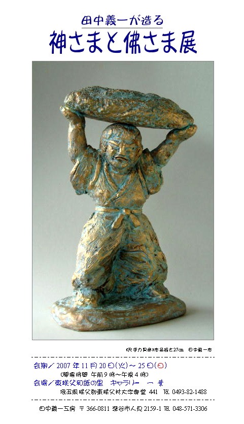 今年の正月より 粘土の佛さまと神さまを作り続けてみました。作品を並べてみますと 「人間一人の力なぞ」微々たるものだと感じます。それでも 自分の手から生まれてきた作品です。ボーッとした表情の神さまや佛さまに似合う会場を探して展覧会を開いてやります。見つかりました。昔ながらの里山が残る 東秩父村和紙の里です。晩秋の紅葉狩りしながらお越し下さい。