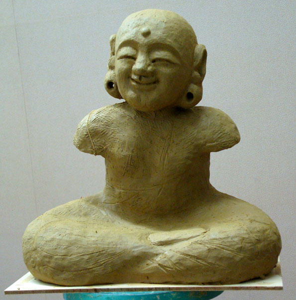 上部と下部を接合しました。このときはまだ 底が開いたままになっています。下から手を入れ およその形が完成するまで 中からと外側とで成形します。この段階で手を付けないのは 胸部や腹部の成形をらくにするためです。前面の部位がほぼ完成したあと 手の成形に移ります。