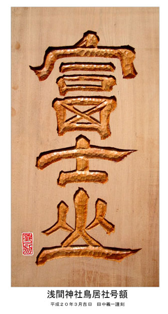 当所在住の宮大工清水進一氏が 厳選したケヤキ材を使い刻んでいます。鳥居中央に掛ける「社号額」を彫らせてもらいました。着色して完成させます。落慶祝いは