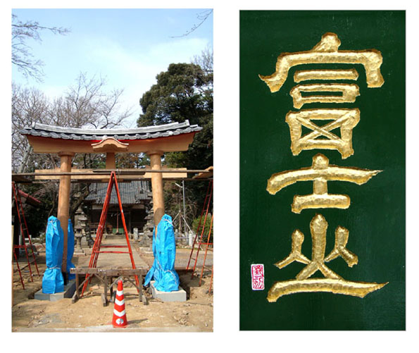 鎮守様の鳥居が間もなく落慶の日を迎えます。名工清水進一氏によって 新築中の鳥居が姿を現しました。バランスのいい見事な鳥居です。棟木の左側には 義一謹刻の「木花開耶姫像」埋め込まれています。「社号額」も彩色して完成しました。鳥居の祭式が終わったあと 中央に掲げられます。来る4月13日午前10時から華やかに「初くぐり祭典」を執り行います。