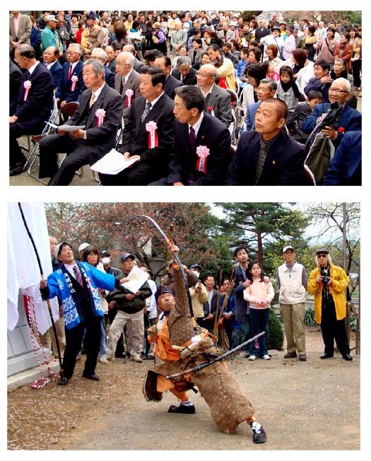 4月13日鳥居・狛犬落慶祭典が無事終了しました。祭典の前に 「鏑矢の奉射」 という珍しい神事を行いました。これは 狩衣装束で古式の弓矢を持ち舞ながら 矢を放つ儀式です。初めて見る演舞に数百人の参拝者は大喝采でした。演じてくれたのは当所出身の騎馬文化研究家の清水さんです。