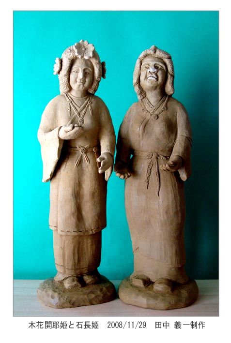 | 木花開耶姫を見そめた邇邇芸命は、姫の父神大山津見神に結婚の申し入れをしまし た。大山津見神はこころよく承諾して、姉の石長姫も一緒に送り届けました。邇邇芸 命は石長姫を一目見るなり直ぐに帰してしまったのです。石長姫の容貌が余りにも醜 かったからです。大山津見神は「石長姫は岩のように永遠の生命力持っているが、木 花開耶姫の命は桜花のように短い。」と嘆き悲しみました。その時人間の寿命が決 まってしまったのです。古事記を語った稗田阿礼は、人の生命力と寿命について、物 語のどこかに記しておかなくてと思ったのでしょう。 |