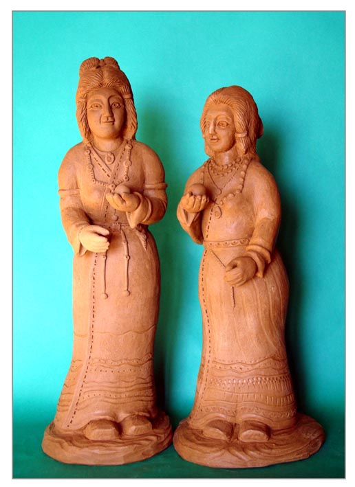 | 前回制作した玉依姫(左側)を制作中に 玉津島神社の近くの知人が「私の家の氏神 さまに欲しい」というので 嫁に出すことにしました。2作目(右側)を追加制作し ました。玉依姫は海に帰ってしまった姉の子(鵜葺草葺不合命)を養育しました。鵜 葺草葺不合命が成人した後 二人は結婚するのです。叔母と甥が結婚したことになり ます。大昔ではそう珍しいことではなかったようです。二人の間には4人の子どもが 産まれましたが その一人が神倭伊波礼毘古命で 後の神武天神武天皇と言われています。 |