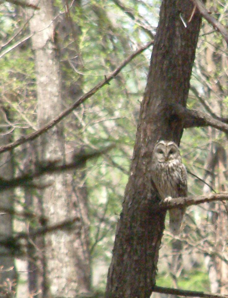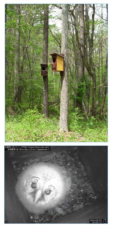 巣箱近くで見守る母フクロウ(愚甥撮影)