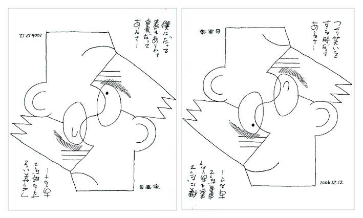 長丁場の長慶個展が6月6日で閉幕です。このシリーズが最後に長慶自画像を配信します。1枚の色紙絵です。反転すると違った長慶像があらわれます。付記された「僕にだって 表もありゃア 裏だってあるさ・・・」効いています。