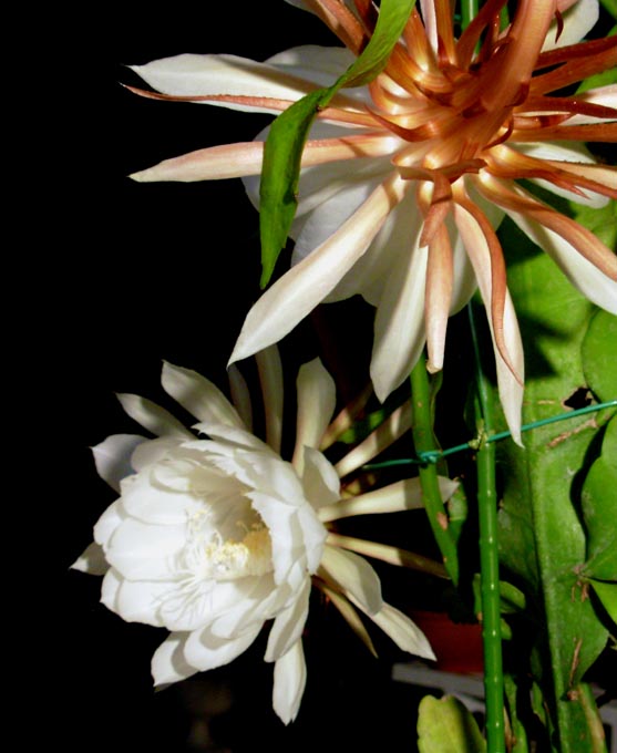 今年2度目の開花です。気にとめもしないでいましたら 部屋の中まで香りが届いてきました。おもてに出てみると2輪が向かい合って咲いていました。夕方咲き始めて7,8時間の短い命ですが これほど華やかな花はないと思います。