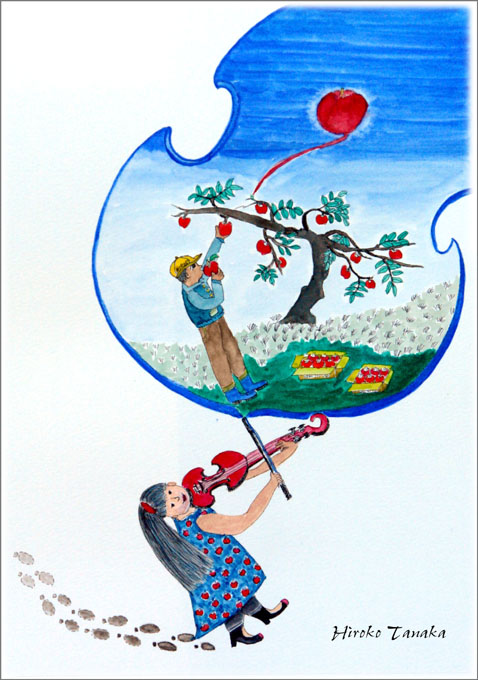 天満敦子コンサートでは演奏されませんでしたが 信州でのリンゴ狩りの時 てんまコンサートを思い出したのでしょう。リンゴ園の主人を主役にこんな絵を描きました。リンゴの気持ちがよくわかる主人です