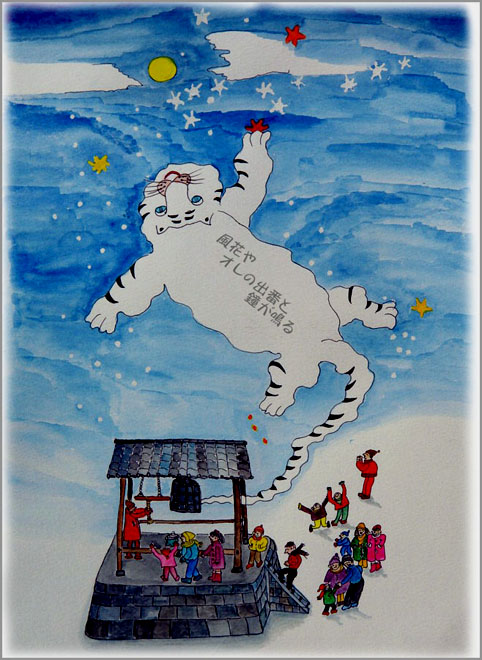 わが家のもう1枚の年賀状です。大みそかは寺の除夜の鐘係だったので 参拝者に甘酒をふるまいました。明けて氏神の浅間神社に参拝しました。帰宅して家内は賀状を描き始めました。梵鐘から干支のトラが檀家や氏子に新年を祝ってまわりました。