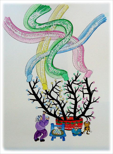 私の母は貧しい農家の生まれで 娘時代には農閑期に糸取工場で女工をしていました。工場では年1回糸取コンクールがあったそうです。大勢の女工の中で優勝するのは何時も母でした。母が健在のころ このことを自慢して黄ばんでしまった賞状を見せてもらったことがありました。繭玉作りをしながら この話しを家内にすると「おかあさんの紡いだ絹糸が外国の貴婦人を飾ったのですね」とこんな絵を描きました