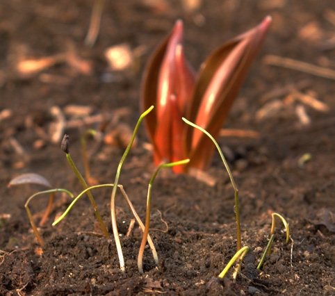 気温が10℃前後の日が続くとカタクリがいっせいに活動をはじめます。カタクリは野草の王様だと思っている私にとってこの季節が一番ワクワクする時です。夜が明けるとすぐにカタクリ圃場に見に行くことから一日がはじまります。カタクリは実生のあと7、8年かけて花芽を付けた成苗になります。写真の前に細く伸びた芽が実生の1年生です。