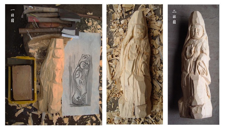 研ぎ上げたナタ類を試し切りしながら 観音さんを彫ってみました。計画図を描いておきましたが 図の通りに彫っていくわけではありません。荒木の中には節や汚れがあるものです。これらの不要な部分は裁ち落しながら作像します。荒彫りから 部分彫り 仕上げ彫りと仕事を進めますが どの段階でも「観音さま」になっているように作業をします。