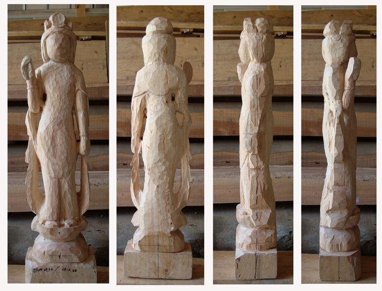 制作開始から実働5日目です。邪念の多い私ですので 今回の観音さまの高さは108cmにしました。煩悩が一つでも取り払われたらいいと思っています。全面の図柄を基準に背面・左右側面の各部の位置関係を確認しながら全体を彫っていきます。およその形が現われてきました。