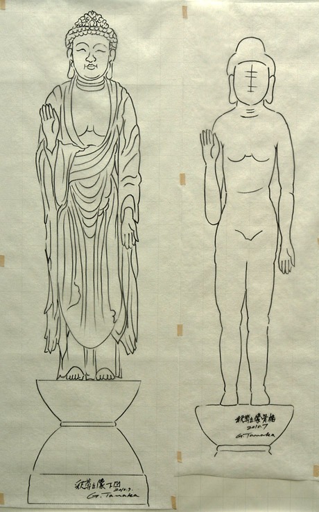 釈尊立像下図を見ながら体形図を描いておきました。お釈迦さまに裸になってもらうのは心苦しいのですがこの図を描いておくと成型の時に役立つのです。右の裸像に左図のような衣を着せていく成型方法をとります。涼しい日を探して作業に取り掛かります。