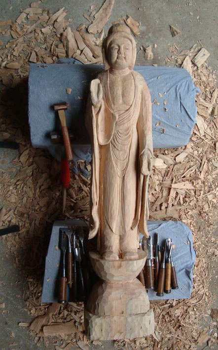 お釈迦さまが現われてきました。制作している者には変化していないように見えても ノミを叩いているとお釈迦さまらしくなってきます。時折立たせて遠くから眺めて全体もバランスを考えて彫り進みます。