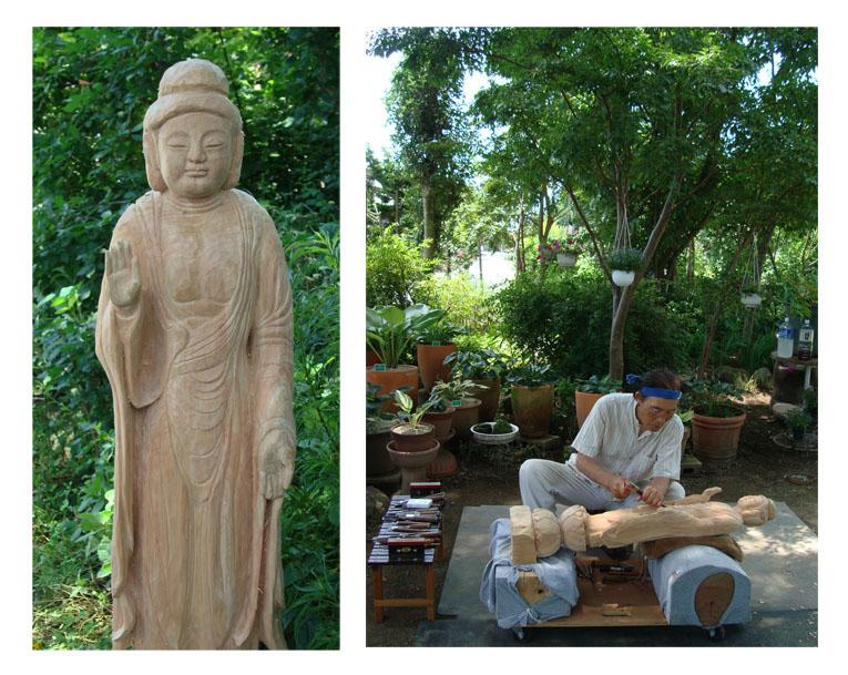 暑中お見舞い申し上げます。暑いですね。作業場での仕事に耐えられなくなったので 我が家で1番風通しのいい木陰に作業場を移しました。快適です。制作途中のお釈迦さんも心なしか穏やかに見えます。衣を着せる作業に入りました。流れるような衣の線が 見る人に癒しを与えてくれるように思います。そのため躊躇しないで一気に彫っていくように努めています。