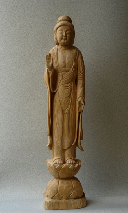 7月になって制作を開始した釈尊立像が完成しました。一通りノミが入れ終わったので このまましばらく観賞します。材料の木は彫って新しい肌を出すと次第に締まっていくものです。2,3週間後ノミを入れ肌を整えて最終的な完成作品になります。