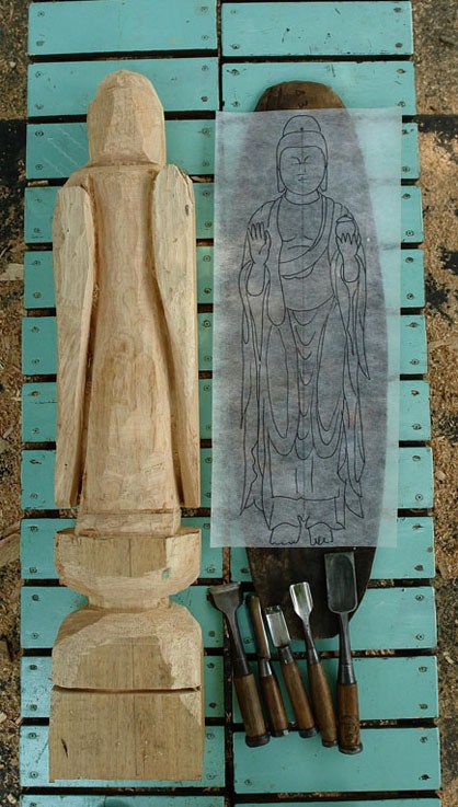 釈迦・阿弥陀・大日・薬師の四尊が如来さまです。仏の世界の重役です。如来さんの特徴は釈尊像が基本になっています。ほとんど同じ姿をしています。見分けが付きにくいのですが 見分けるポイントは手の形「印」です。印については後日お話します。薬師さんが他の三尊と違うのは薬壺を持ていることです。制作にあたって右手の「印」の位置と左手の「薬壺」の位置は意識して彫っていきます。
