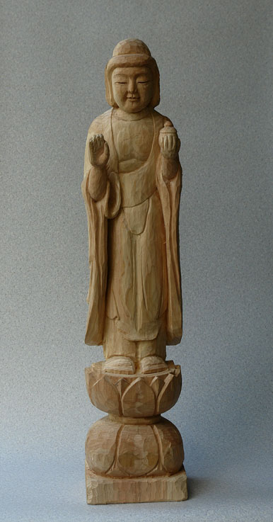 一通りノミが入れ終わりました。折り返し点です。これから小作りに入ります。薬師如来は「医者の王様」です。左手にはどんな病気や障害を治すための「薬壺」を持っています。右手は施無畏印(せむいいん)です。これはどんな願いも叶えてくれる印です。一応顔作りをしましたが 作り手の精神が軟弱のため威厳のある表情になっていません。もう ひと工夫します。