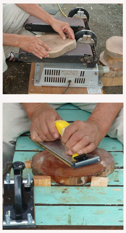 仏像制作を一先ず休憩をして 木口版画作りをします。木口版画とは木の切り口に版を作る版画です。柘植・椿・山ザクラ等の材が適しています。用材を丸太切りした板を ベルトサンダーで表面を平らに磨きあげるのが最初の作業です。次に水サンドペーパーで水研ぎをします。60番で荒研ぎをして100番で仕上げ磨きをして版木が完成します。