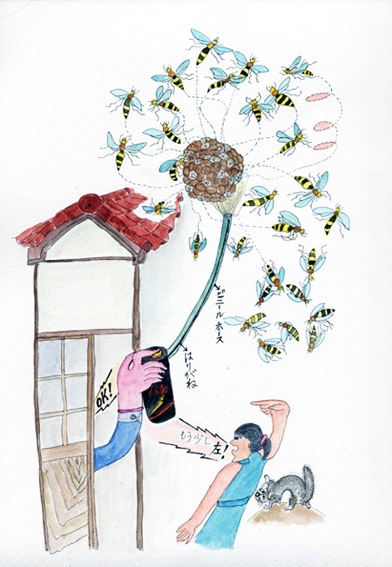 | *蜂の巣は、全部の蜂が巣に戻っている夜間に駆除するのが正解です。昼に駆除しても、出かけている蜂が戻ってきて、同じ場所に延々と巣を造り続けます。「スズメバチジェット」というスプレーは、長距離に噴射できて即効性があるので、非常に有効です。(配信者の甥記) |