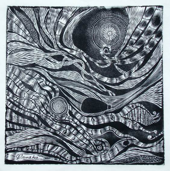 スクェアビュラン1本で彫り上げた版を刷ってみた。この刀の特性がよく作品に表現できた。満足度80パーセント。作品名を刀の名「スクェアビュラン」とした。