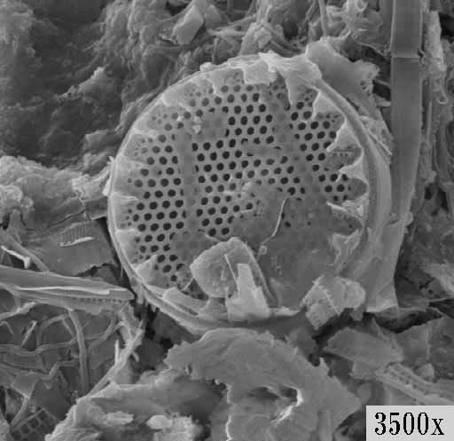 円盤状のケイソウ の一種。小型の種類 でふるいのように穴 が開いています。