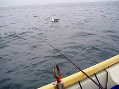 人様の釣った獲物を横取りしようという魂胆のようだが、なんとカモメが加えた瞬間に、フラシを縛っていた紐が解け魚の入ったフラシが流出、慌ててアンカーを上げ回収に向う。