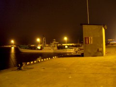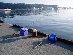 現地には午後6時頃到着、あまり天気がよくないが予定の北防波堤先端は先客でびっしり、やむなく漁協前の岸壁、左側の船揚げ場の横で竿を出す。