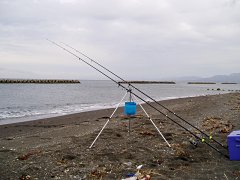 4.2m投げ竿+投げ専用スピニングリール 投げ天秤仕掛け(流線11号・2本針)+30号L型テンビン 活青イソメ