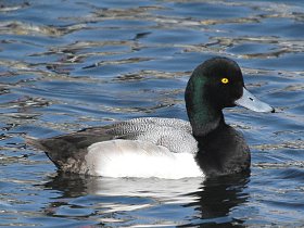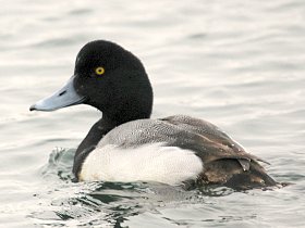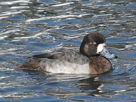メスは全体に褐色で、「キンクロハジロ」のメスに似るが、「スズガモ」はクチバシの付け根が白いので識別が可能。 |