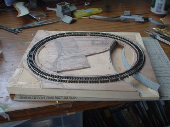 小さくてもレイアウトの作り方は一緒です。路盤と同じ高さになる部分を残してベニア板をカットします。一段下がった所は畑になります。右の写真の溝は玉川上水です。