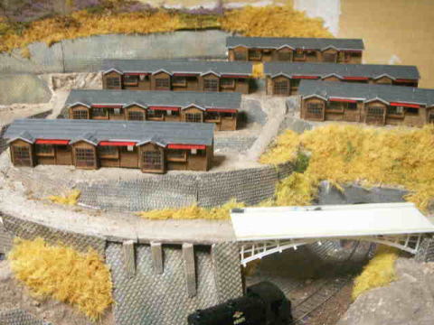 炭住の配置場所の確保は、石膏工作が終わった部分を再度剥がしてから地形を作りました。ストラクチャーが形になる前に地面を作ってしまうと、配置の時点で計算外の事があるものです。 地形が出来、ストラクチャーを借り置きした状態です。建物手前のスペース不足が気になります。