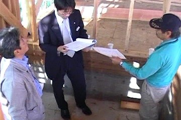 ユニットバスのメーカーはタカラです。メーカーの営業の方と取り付け業者の方、設計士の仲村さんで打ち合わせをしています。