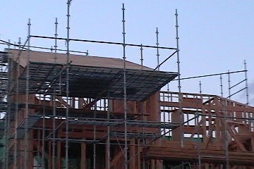 オパス株式会社さんにお願いしています。前にも書いたように最頂約12Mのとこまで作業をしやすくするため、また大工さんの安全を守るためいい仕事してもらっています。私もたまに上に上がりますがやはり足がすくみます。