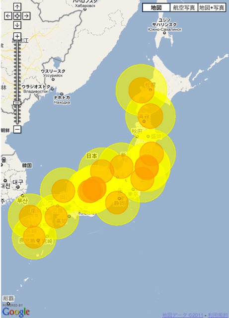 3は各原発が事故を起こしたときに影響が予想される範囲。黄色が
