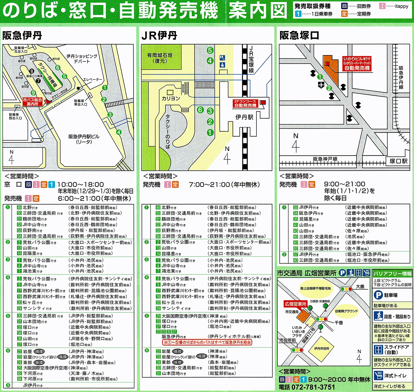 | ☆電車・バスなどのリンク 伊丹市営バス [いたみバスナビ] スマホ対応 伊丹スカイパークや昆陽池周辺へ行くなら伊丹市バスです。 https://itamicity-bus.bus-navigation.jp/wgss/search.html 市バスについて下に補足説明を追記しました。 阪急バス 豊中つばさ公園『ma-zika』や千里川土手へ行くには阪急バスです。 全路線図の[豊中市(中部)]に、公園近くを通る 阪急曽根駅とJR伊丹駅近く結ぶ路線が掲載されています。 https://www.hankyubus.co.jp/rosen/route_search/ JR西日本 〔JR西日本 おでかけネット〕 https://www.jr-odekake.net/index.htm 阪急電鉄 https://www.hankyu.co.jp/ 大阪モノレール https://www.osaka-monorail.co.jp/ ☆ 伊丹市バスについて: ◎.イコカやスイカなどの交通系ICカードを使えます。一乗車均一料金なので乗車時にピッをするだけで、降車時はカードタッチなど不要で、そのまま下車するだけです。車内でチャージは出来ないので、事前に鉄道駅などでカード残金を確認しておくようお勧めします。 ◎.ほとんどのバスは、JR伊丹駅を起点として阪急伊丹駅を経由して運行しています。また、行き先が同じでも途中の経路が違う路線が多くありますので、路線番号(※※番****行きの、※※の部分)にも注意してください。 ◎.バスを乗り継ぐ場合は交通系ICカードで乗車の場合、最初の乗車から60分以内に次のバスに乗り継いだら二回目の乗車に「乗継割引」が適用されて、少しおトクになります。空港や伊丹スカイパークから瑞ケ池・昆陽池方面へ行くなどでバスを乗り継ぐなどの場合は上手に使って下さい。詳しくは市バスのホームページを参照してください。 ◎.電車で伊丹駅まで来られたら、阪急伊丹駅に「市バス総合案内所」がありますので、「伊丹市営バス ガイド&MAP」を入手しておかれるのも良いかも知れません。JR伊丹駅の改札を出た右方の「自動発売機」の所にもバスのガイド&マップを置いてあります。 下の図は2022年9月に貰った「伊丹市営バス ガイド&MAP」の、(鉄道駅前の)のりばや窓口などの案内を書かれた部分です。実際に行かれる場合は変更されているかも知れませんので、ネットなどで事前確認されるようにお勧めします。 図をクリックすると大きいサイズで見られます。プラウザの戻るボタンで戻って下さい。