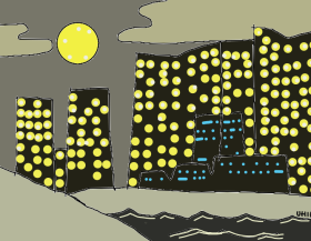 | 3時間半の時間調整・・、何してんの? ・ 早めに消灯し、乗客を強制睡眠させ、船員さんの大宴会? ・ 飛行機の着陸待ちみたいに、大きな円ぐるぐる状態? ・ こっそり錨おろして、全員休憩? |