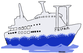 | BACK | 乗船のご案内のアナウンスがあり、ぞろぞろと船(サルビア号)へ移動。 階段状のタラップ上るのかと思ってたら、飛行機のボーディングブリッジみたいので乗船するのんね。 船長さんかしらん、偉い風の人に御挨拶されながら乗船。 |